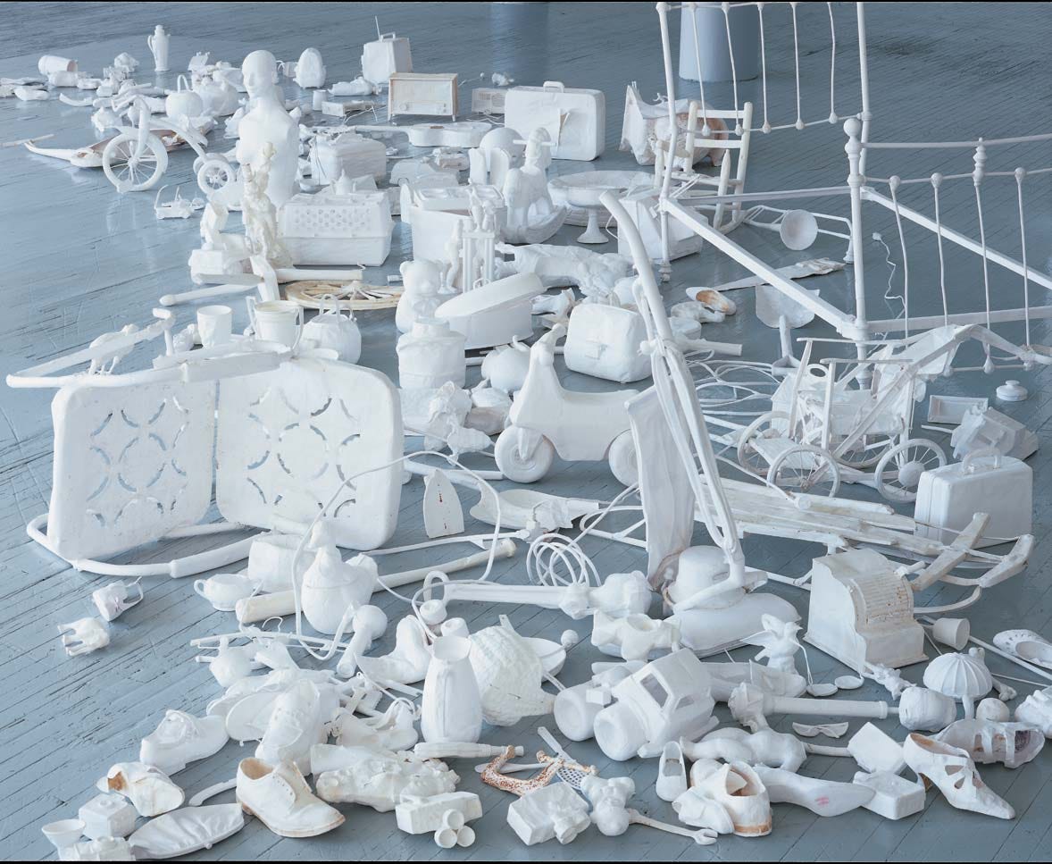 To create the installation, Drew collected over four hundred everyday objects— toys, furniture, appliances, and household wares—from thrift stores, junkyards, and off the street. With a large group of interns and staff, he cast each object in paper, removing the original object once the paper cast was created. They are hollow, nearly weightless forms that echo the original objects from which they were made more than they replicate them.