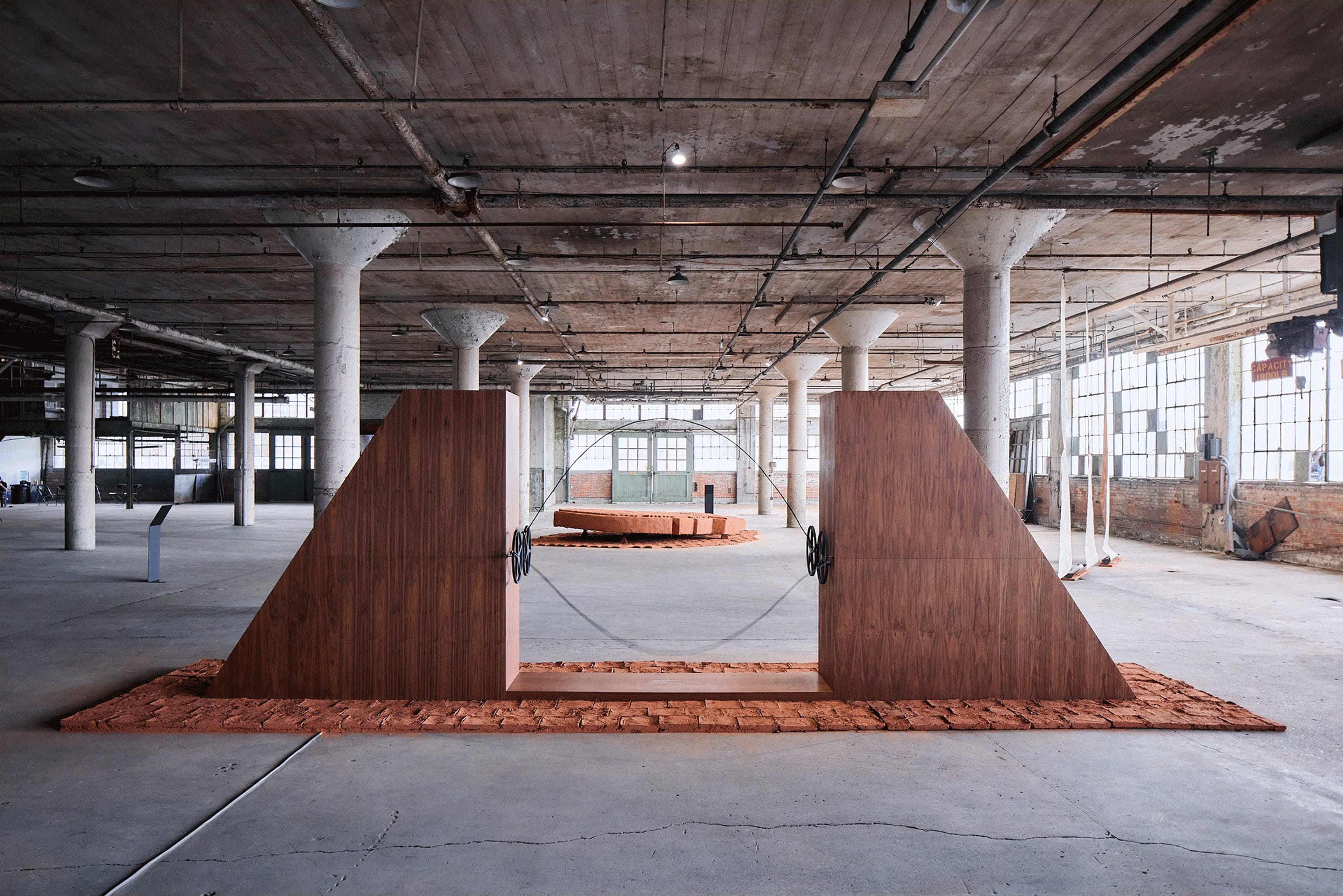 Ascension Device II (actions for earth… or some other oscillation… a haptic and sonic engagement… a breath… or an architecture for gathering between space and time), 2024. Timber, aluminum, polypropylene ropes, spoked wheels, and electric gear motors